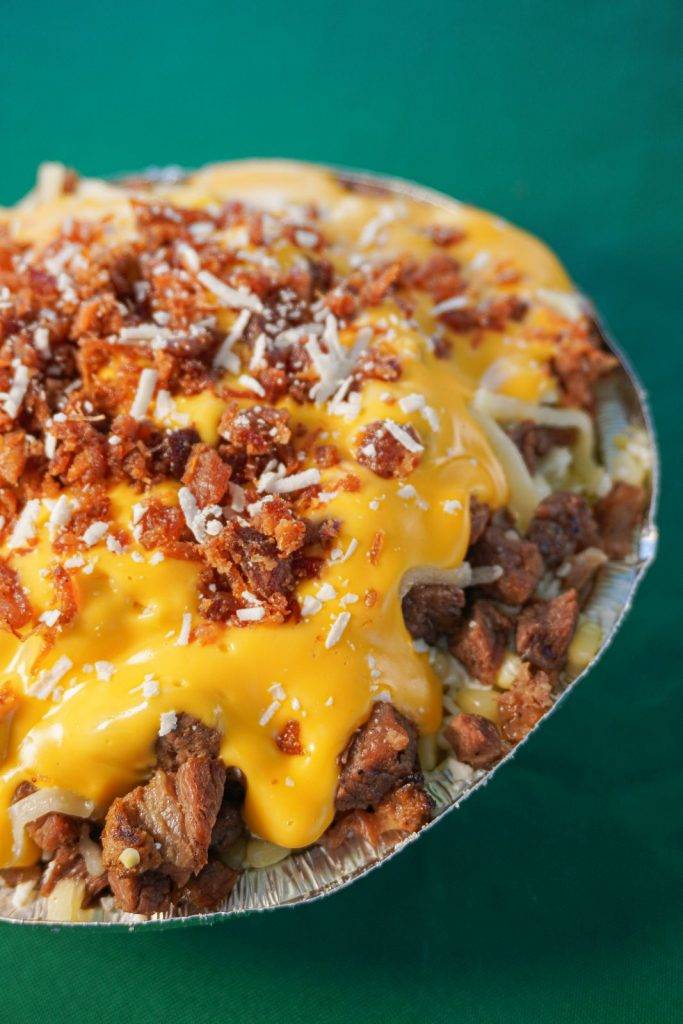 (Salchipapa, queso guoda, queso chedar, carne asada)