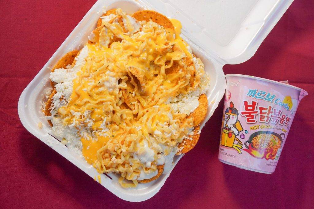 Ramen Buldak, sabrita al gusto, grano de elote, crema, queso cotija, queso cheddar y topping de sabrita.