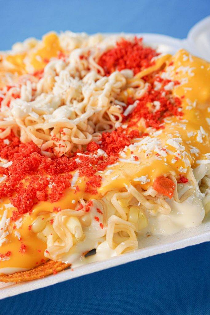 (Doritos nachos, grano de elote, queso blanco rayado, chile preparado, crema, queso chedar)